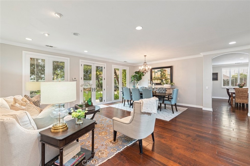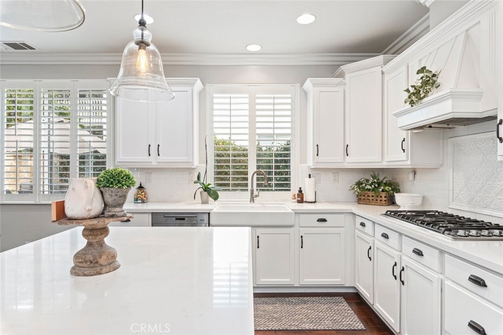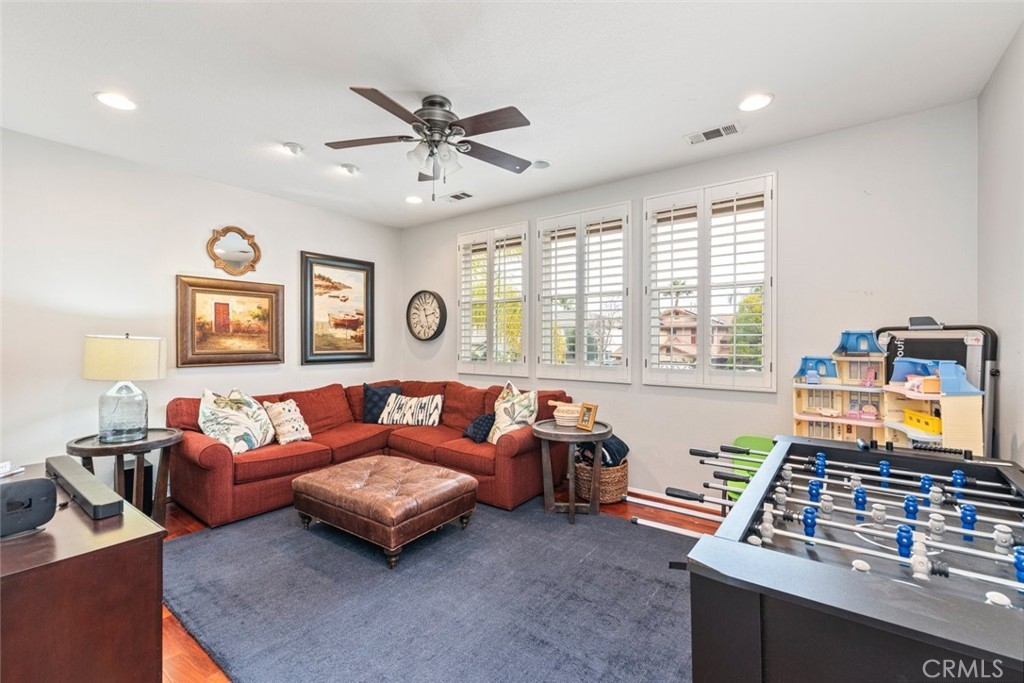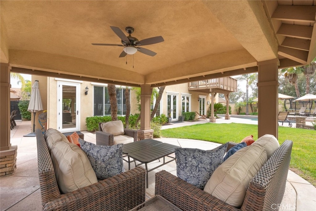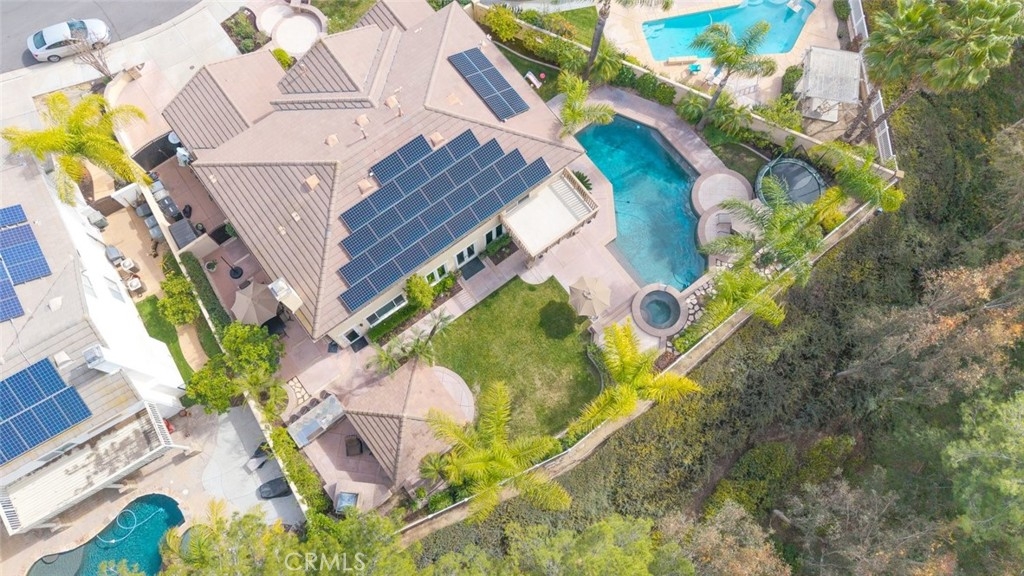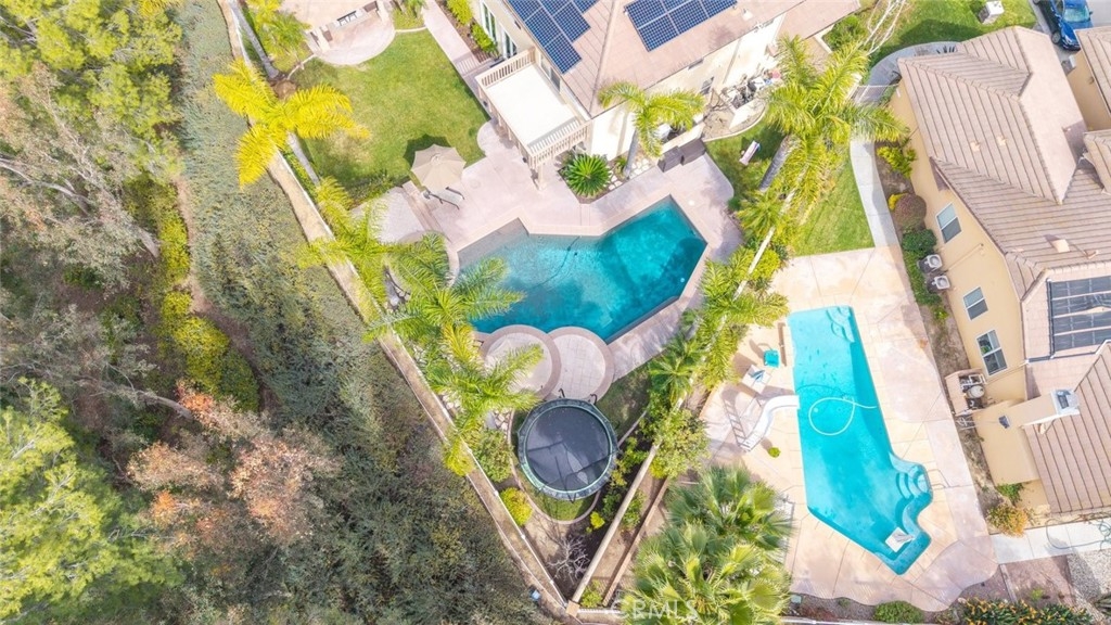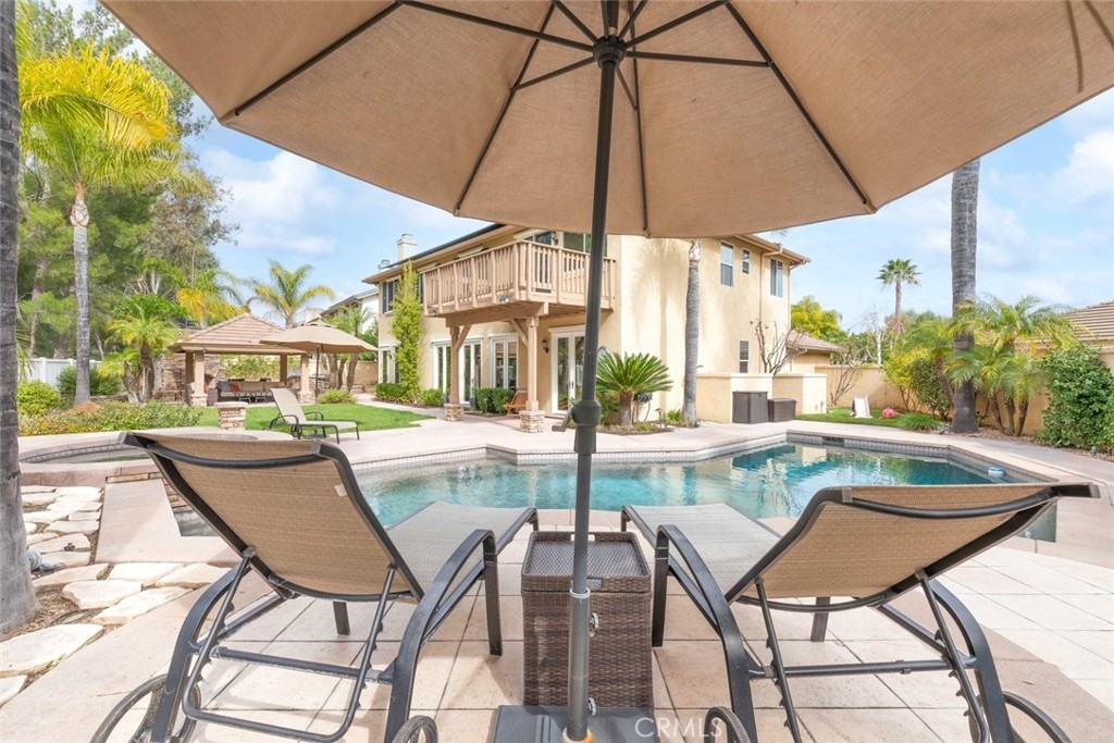 Don’t miss this stunning POOLl and SPA home located in the highly desirable Paseo Del Sol community, offering LOW TAXES, LOW HOA, and beautiful elevated views! This expansive 5-bedroom home with a separate den/study and 3 full bathrooms has been tastefully updated throughout and sits on a HUGE lot designed for both everyday comfort and unforgettable entertaining. From the moment you arrive, you’ll appreciate the well-manicured front yard, charming front patio sitting area, and a dedicated space ideal for small RV, boat, or extra parking. Step inside and be greeted by rich hardwood flooring, a dramatic staircase, and striking floor-to-ceiling windows overlooking the formal living space, filling the home with natural light. The fully remodeled kitchen is a chef’s dream, featuring a Viking cooktop, quartz countertops, farmhouse sink, stainless steel appliances, and abundant cabinetry. A built-in media desk and work area add functionality, while bar seating with pendant lighting opens seamlessly to the family room, creating a true great-room feel anchored by a cozy fireplace. A new French door leads directly to the backyard, blending indoor and outdoor living. The formal living and dining rooms are generously scaled and highlighted by impressive windows with views of the backyard and beyond. Downstairs also includes a large laundry room with sink and storage, a den or office that can serve as a sixth bedroom, a dedicated wine or storage area, and a spacious bedroom with walk-in closet and an updated full bath nearby—perfect for guests or multigenerational living. Upstairs, the primary suite is a private retreat featuring a newly redone view deck, built-in closet systems, dual sinks, a separate soaking tub and shower, vanity area, and dual walk-in closets. A sizable loft provides space for a game room, media lounge, or home gym. The upstairs hall bath includes dual sinks and a tub-shower combo. Additional highlights include crown moulding and plantation shutters throughout, overhead garage storage, newer dual AC systems and furnace, and thoughtful upgrades at every turn. The backyard is a true paradise with a Pebble Tec pool and spa, massive free-standing covered patio, built-in BBQ bar seating, outdoor fireplace, side patio, large grass area, and beautifully manicured landscaping. Ideally located near shopping, dining, businesses, and award-winning Temecula schools, this home offers luxury, space, and lifestyle in one exceptional package.